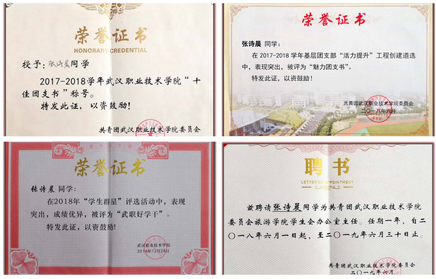 張?jiān)姵揩@得的榮譽(yù)證書(部分)