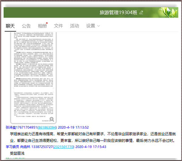 朋輩之間的交流更容易引起共鳴,張?jiān)姵壳檎嬉馇械脑捳Z在班級(jí)群里激起波瀾,同學(xué)們推心置腹地交談,或反思,或提建議,或分享疫情期間的成長(zhǎng)感悟,氣氛融洽。有同學(xué)說,“疫情之下宅在家里學(xué)習(xí),少了老師的約束和監(jiān)管,多了散漫和自由。學(xué)姐的一番話讓人覺得溫暖,也給我們及時(shí)敲響了警鐘?!?/span>旅管19304班團(tuán)支書亮相,向張?jiān)姵繉W(xué)姐暖心暖肺的寄語和提振精氣神的鼓勵(lì)表示感謝,分析了團(tuán)支部工作存在的問題,承諾“一定會(huì)不忘入學(xué)初心,砥礪奮進(jìn),努力做到更好”。