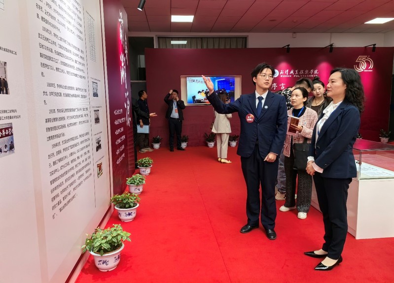 同期,由董玉玲、鮑杰、張皓天等人組成的首批學(xué)生校史講解員經(jīng)過培訓(xùn)正式“上崗”,于學(xué)校五十周年校慶當(dāng)日,為線下展覽參觀者講述校史。2022級旅游管理專業(yè)學(xué)生張皓天感觸尤深:“我們從校史整理者,變成了講述者、傳承者。在講述學(xué)校從一片荒地發(fā)展至今的歷程時,心中的自豪感油然而生。”