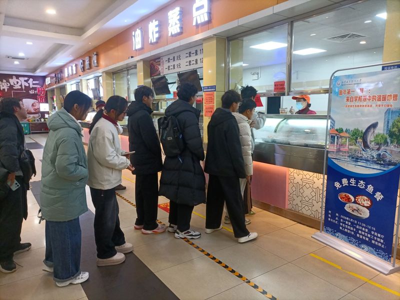 元旦中午,食堂贈(zèng)魚(yú)窗口前排起了長(zhǎng)隊(duì),學(xué)生憑校園卡、教師憑教工卡有序等候。現(xiàn)場(chǎng)魚(yú)香四溢,笑聲不斷,節(jié)日的快樂(lè)值直接拉滿(mǎn)!